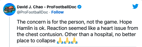 “When this happened, I tweeted basically instantaneously when I saw the replay that, let’s worry about the player,” said orthopedic surgeon David Chao, who was the Chargers’ team doctor from 1997 to 2013. “This is his heart. But I had no idea they were doing CPR and all this other stuff.